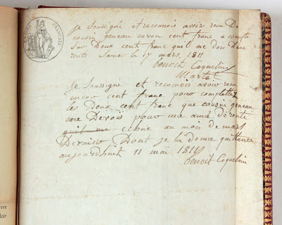 1) reconnaissance de dette signée de Benoît Coquelin (père des frères Coquelin, boulanger à Boulogne-sur-Mer) datée du 17 mars 1811 et du 11 mai 1811 (1 p. in-8),
